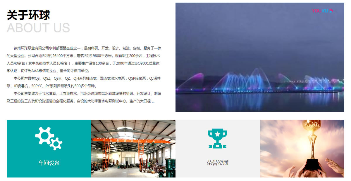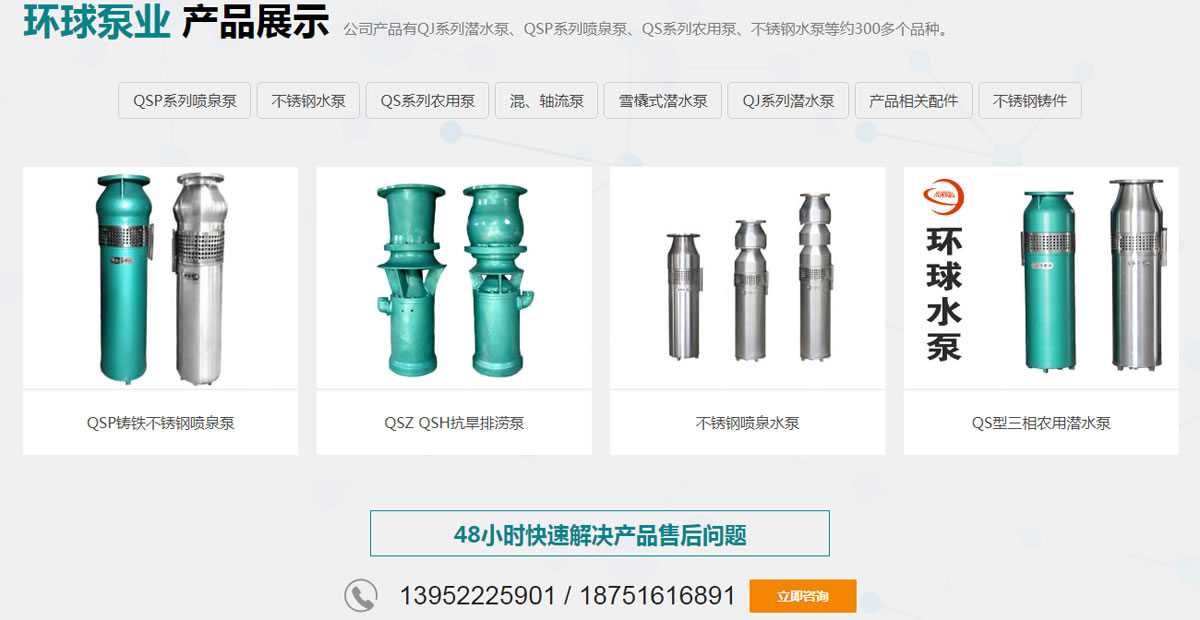 徐州環球泵業有限公司水利部百強企業之一,是融科研、開發、設計、制造、安裝、服務于一體的大型企業。本公司產品有QS、QSZ、QSH、QZ、QH系列軸流式、混流式潛水電泵,QSP噴泉泵,QJ深井泵,JP噴灌機,50PYC、PY系列搖臂噴頭約300多個品種。 本公司主要致力于節水灌溉、工農業排水、污水處理城市給水領域設備的科研、開發設計、制造及工程的施工安裝和設施運營的全程化服務。