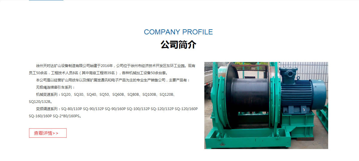 徐州天時達礦山設備制造有限公司始建于2016年,是以經營礦山用絞車以及煤礦漏泄通訊和電子產品為主的專業生產銷售公司。